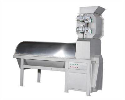 石榴從進料斗進入上壓碎裝置,上壓碎裝置將石榴壓開,下壓碎裝置再次將石榴擠壓,經過兩級擠壓的石榴已基本皮籽分離,并落入分離裝置,石榴籽從篩孔落下,皮從尾部排出, 籽及汁用另配的螺桿泵送至下道工序。
