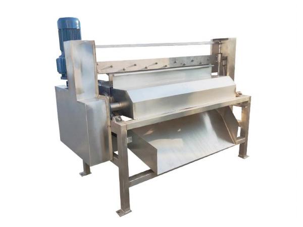 該機主要用于桃、杏等核果類水果在常溫下去核。在核果類水果的果漿生產(chǎn)線上是關(guān)鍵設(shè)備之一。通過旋轉(zhuǎn)的齒輥和膠輥除去桃子、杏子中的果核得到塊狀果肉。兩輥之間的間距根據(jù)不同的水果而定,水果由前道設(shè)備送入進(jìn)料斗由曲柄連桿機構(gòu)帶動壓果板把水果壓入兩之間。兩根輥相互對轉(zhuǎn),水果上大部分果肉被壓入齒銀的縫隙中,果核被擠在具有彈性的膠輥內(nèi),梳子板把果肉從齒盤片間隙內(nèi)挖出。帶果肉的果核進(jìn)入洗核部件完成肉核分離。